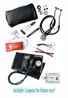 Sprague Stethoscope with replacement eartips and parts Aneroid sphygmomanometer with zippered carrying case Upgraded dissection kit with hard plastic carrying case with fitted slots for instruments Scalpel with #10 blade Forceps Teasing needles and dissecting pins EKG caliper with plastic protective cover with gauge Penlight with pupil gauges CPR clear mouth shield Black and red china labwork markers Stainless steel bandage scissor: 5 1/2a McCoy Item # 99061