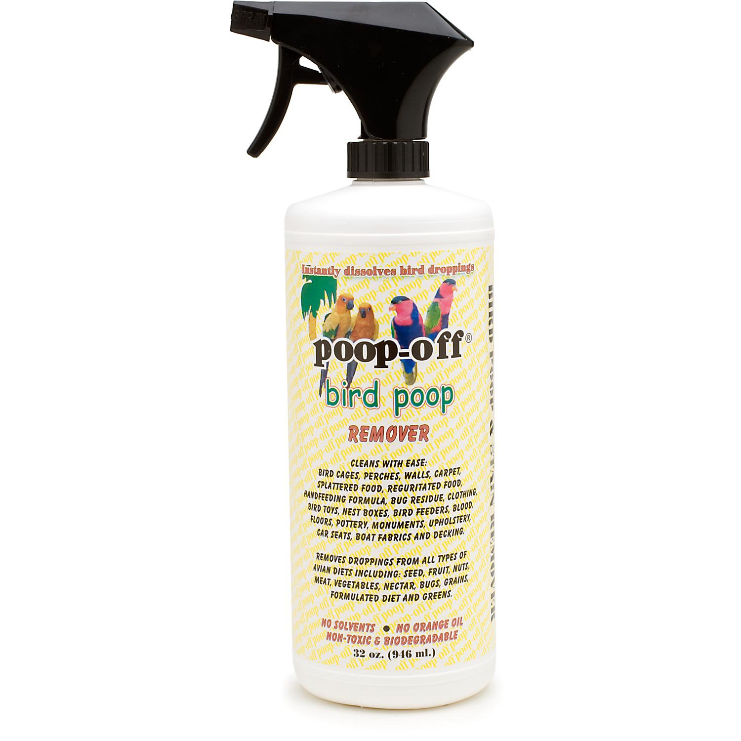 Non-toxic and biodegradable Poop-Off instantly dissolves bird droppings and removes even the toughest stains from cages, perches, clothing, upholstery, carpet, and all washable and painted surfaces.Removes droppings from all types of avian diets including seed, fruit, nuts, meat, vegetables, nectar, bugs, grains, formulated diets, and greens.Cleans with ease:bird cagespercheswallscarpetsplattered foodregurgitated foodhandfeeding formulabug residueclothingbird toysnest boxesbird feedersbloodfloorspotterymonumentsupholsterycar seatsboat fabricsdeckingUsed by bird lovers, breeders, zoos, veterinarians, and bird and pet stores daily to end the tedious task of cleaning up after birds.Guaranteed the finest bird poop remover and laundry pre-spray available.Original pet and wild bird formula.